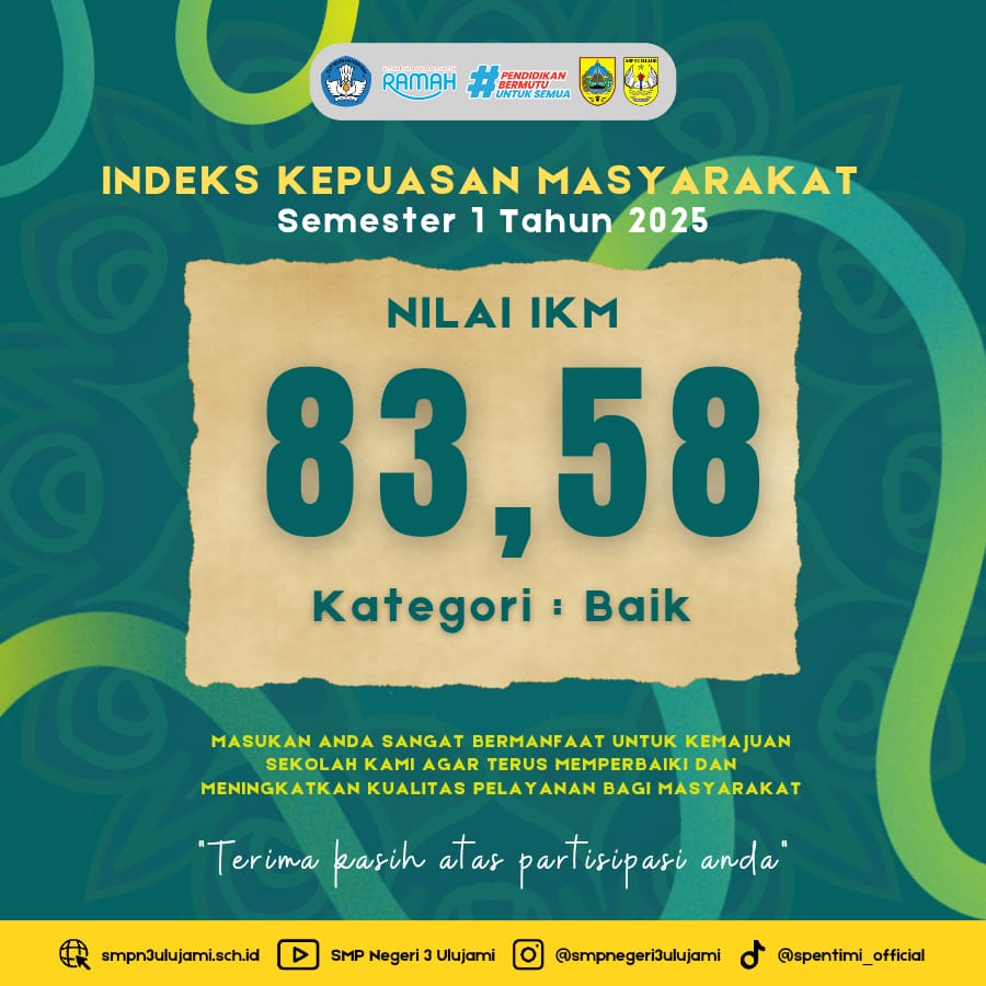Informasi INDEKS KEPUASAN MASYARAKAT (IKM) SEMESTER I TAHUN 2025 Juni 30, 2025Juni 30, 2025 admin Nilai Indeks Kepuasan Masyarakat (IKM) Semester I Tahun 2025 senesar 83,58 dengan kategori baik Share