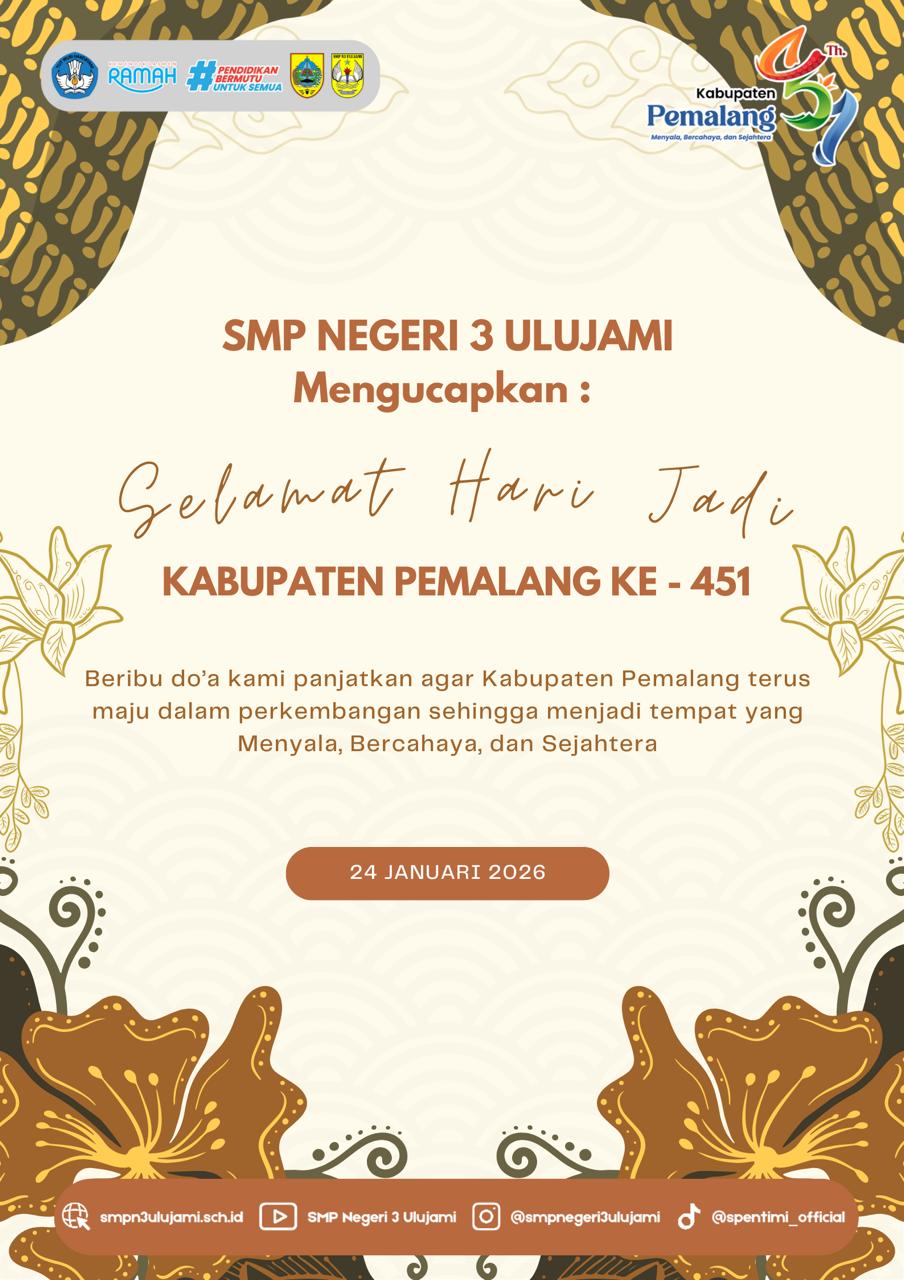Dalam suasana penuh kesederhanaan nan khidmat, SMP Negeri 3 Ulujami menyelenggarakan upacara peringatan Hari Jadi ke-451 Kabupaten Pemalang pada Sabtu, 24 Januari 2026, bertempat di lapangan depan sekolah. Upacara ini menjadi momentum penting bagi warga sekolah untuk menumbuhkan rasa cinta daerah serta meneguhkan komitmen bersama dalam mendukung pembangunan Kabupaten Pemalang.